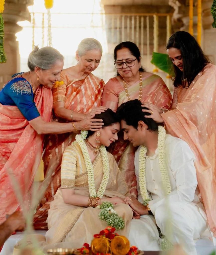 अदिति और सिद्धार्थ की शादी पारंपरिक रीति-रिवाजों के अनुसार हुई। अदिति ने इस मौके पर गोल्डन रंग की एक बेहद ही सादी लेकिन खूबसूरत साड़ी पहनी, जिसे उन्होंने नथ, झुमके, चूड़ियां और चोकर नेकलेस के साथ कंप्लीट किया। वहीं सिद्धार्थ ने सफेद कुर्ता और लुंगी पहनकर अपने लुक को बेहद सिंपल और क्लासिक रखा। दोनों के सादगीपूर्ण लुक की सोशल मीडिया पर जमकर तारीफ हो रही है। उनकी शादी की तस्वीरों ने फैन्स का दिल जीत लिया है, जहां दोनों की सादगी और प्यार साफ नजर आ रहा है।