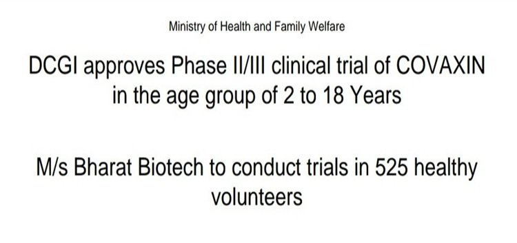 भारत बायोटेक को 2 से 18 वर्ष आयु वर्ग के बच्चों पर कोवैक्सीन के दूसरे और तीसरे चरण के परीक्षण की अनुमति
