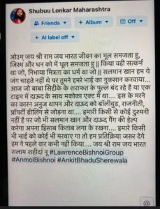 फेसबुक पर शुभु लोनकर नाम के शख्स के इस पोस्ट में कहा गया, सलमान खान हम ये जंग चाहते नहीं थे, लेकिन तुमने हमारे भाई का नुकसान करवाया | पोस्ट में आगे कहा गया, आज बाबा सिद्दीकी की शराफत के पुल बनाए जा रहे हैं, एक टाइम में दाऊद के साथ मकोका एक्ट में था | इसके मरने का कारण अनुज थापन और दाऊद को बॉलीवुड, राजनीति, प्रॉपर्टी डीलिंग से जोड़ना था |