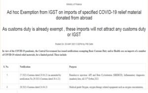 इस छूट से निशुल्क वितरण के लिए कोविड राहत सामग्री का बिना आई-जीएसटी भुगतान के निशुल्क आयात हो सकेगा। राज्य सरकारों से आयातकों को यह सुविधा उपलब्ध कराने के लिए नोडल प्राधिकरण नियुक्त कराने को कहा गया है।