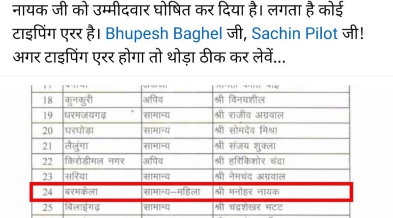 रायपुर : छत्तीसगढ़ में नगर निगम और पंचायत चुनाव की तैयारी जोरों पर है और इस संदर्भ में कांग्रेस पार्टी के एक कदम ने राजनीति में हलचल मचा दी है। कांग्रेस ने हाल ही में बरमकेला नगर पंचायत के महिला सीट पर श्री मनोहर नायक का नाम उम्मीदवार के रूप में घोषित किया है, जो इस गलती के बाद चर्चा में आ गए हैं। छत्तीसगढ़ के मंत्री ओपी चौधरी ने इसे एक टाइपिंग एरर करार दिया और पार्टी के नेताओं, भूपेश बघेल और सचिन यादव से इसे सुधारने की अपील की। उनका कहना था कि यह एक त्रुटि थी और उम्मीद की जा रही है कि इसे जल्द ही ठीक कर लिया जाएगा।