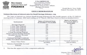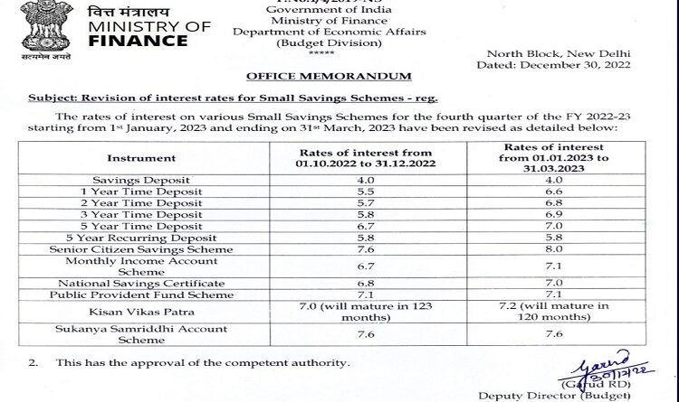 नई दिल्ली: सरकार ने एक जनवरी 2023 से आरंभ हो रही चालू वित्त वर्ष की चौथी तिमाही के लिए विभिन्न लघु बचत योजनाओं की ब्याज दर में वृद्धि की है। पांच वर्ष की राष्ट्रीय बचत योजना में ब्याज दर 6.8 प्रतिशत से बढ़ा कर 7 प्रतिशत कर दी गई है।