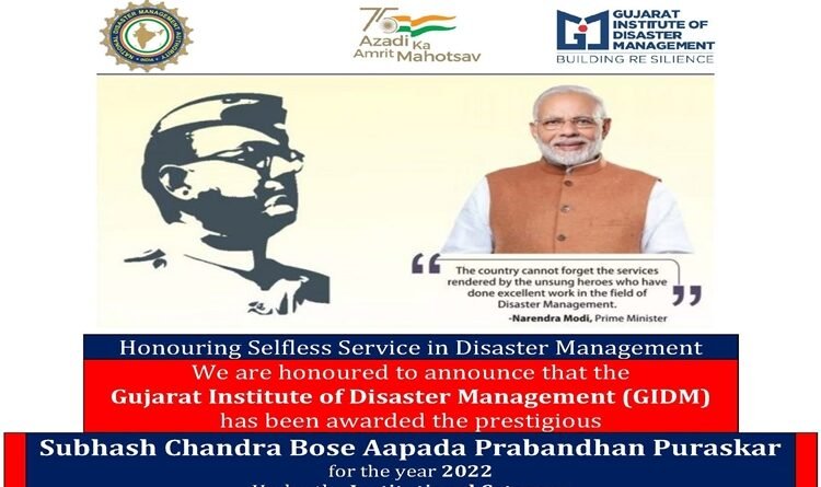 नई दिल्ली :- गुजरात आपदा प्रबंधन संस्थान और प्रोफेसर विनोद शर्मा को वर्ष 2022 के लिए सुभाष चन्द्र बोस आपदा प्रबंधन पुरस्कार के लिए चुना गया है। यह पुरस्कार संस्थान और व्यक्तिगत श्रेणी में दिया जाता है।