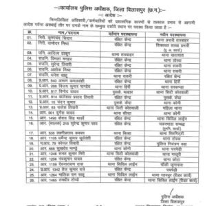 बिलासपुर | बिलासपुर में पुलिस विभाग में हुए इस फेरबदल के तहत 26 पुलिसकर्मियों का स्थानांतरण किया गया है। एसपी रजनेश सिंह द्वारा जारी आदेश में उल्लेख किया गया है कि निरीक्षक कृष्णकांत सिदार को तारबाहर थाने की जिम्मेदारी सौंपी गई है, जबकि निरीक्षक दामोदर मिश्रा को शिकायत शाखा का प्रभारी नियुक्त किया गया है। इससे पहले दोनों निरीक्षक रक्षित केंद्र में पदस्थ थे।