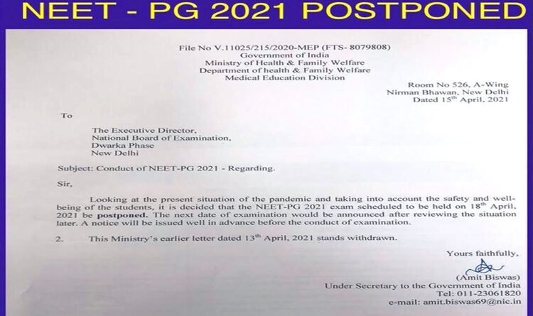 नई दिल्ली :- सरकार ने कोविड के मामलों में तेजी से हो रही वृद्धि को देखते हुए राष्ट्रीय पात्रता सह प्रवेश परीक्षा-स्नातकोत्तर (नीट-पीजी) परीक्षा -2021 को स्थगित कर दिया है। परीक्षा की अगली तिथि की घोषणा स्थिति की समीक्षा के बाद की जायेगी।