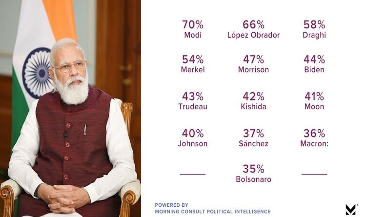 अमरीका के राष्ट्रपति जो बाइडेन 44 प्रतिशत के साथ छठे स्थान पर हैं। कनाडा के प्रधानमंत्री जस्टिन ट्रूडो 43 प्रतिशत के साथ सातवें स्थान पर और ब्रिटेन के प्रधानमंत्री बोरिस जॉनसन 40 प्रतिशत के साथ शीर्ष दस में शामिल हैं।
