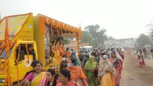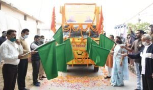 गरियाबंद :- श्री राम रथ आज सुबह राजिम के श्री राजीव लोचन मंदिर परिसर से जैसे ही नयापारा के लिए रवाना हुई पूरा वातावरण राममय हो उठा। जय श्री राम के उद्घोष के साथ मौहोल गुंजायमान हो गया। स्थानीय नागरिक रामरथ के एक झलक पाने आतुर हो रहे थे। 300 से ज्यादा बाईक सवार रामरथ के आगे-आगे चल रहे थे। सुमधुर राम भक्ति से ओतप्रोत और अध्यात्मिक मौहोल में रामरथ राजिम से नयापारा की ओर बढ़ने लगी। कलेक्टर निलेशकुमार क्षीरसागर, पुलिस अधीक्षक भोजराम पटेल, जिला पंचायत अध्यक्ष स्मृति ठाकुर, स्थानीय जनप्रतिनिधि और आम नागरिकों ने हरी झण्डी दिखाकर रथ को रवाना किया।