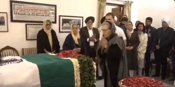 नई दिल्ली । कांग्रेस संसदीय दल की नेता सोनिया गांधी, पार्टी अध्यक्ष मल्लिकार्जुन खरगे, पूर्व अध्यक्ष राहुल गांधी तथा महासचिव प्रियंका गांधी वाड्रा ने पूर्व प्रधानमंत्री मनमोहन सिंह के अंतिम दर्शन करते हुए उनके पार्थिव शरीर पर पुष्पांजलि अर्पित की है। डॉ. सिंह को श्रद्धा सुमन अर्पित करने के लिए कांग्रेस नेतृत्व के साथ ही विभिन्न दलों के प्रमुख नेता पहुंच रहे हैं। राष्ट्रपति द्रौपदी मुर्मु, प्रधानमंत्री नरेन्द्र मोदी, गृहमंत्री अमित शाह, कई अन्य केंद्रीय मंत्रियों तथा प्रमुख नेताओं ने डॉ. सिंह के पार्थिव शरीर पर पुष्पांजलि अर्पित की है।