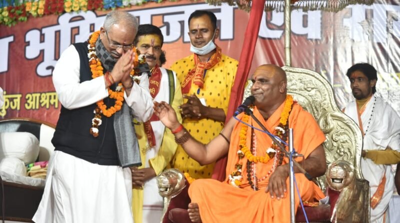 रायपुर :- दुर्ग जिले के ग्राम जजंगिरी में रोहिणी गौशाला के शुभारंभ के अवसर पर आयोजित कार्यक्रम में मुख्यमंत्री भूपेश बघेल जब पहुंचे तो उन्होंने मंच पर आसन ग्रहण न करते हुए संतों के सम्मान में नीचे बैठना उचित समझा। इस पर मौजूद संतों ने मुख्यमंत्री की प्रशंसा करते हुए कहा कि देश की परंपरा रही है कि धर्मगुरु ऊपर आसन पर विराजित होते हैं। मुख्यमंत्री ने यह परंपरा निभाई है, हम उनकी विनम्रता के लिए उनकी प्रशंसा करते हैं।