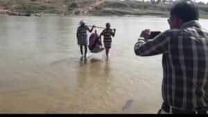 मरकाडाँड़ के महान नदी में एक बीमार ब्यक्ति लगभग 70 वर्ष को झेलगी से कावर में ढो कर नदी को पार कर ले जाते मरका डाँड़ के लोग।