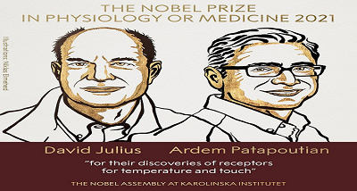 अमरीका के डेविड जुलियस और अरदेम पातापोटिएन छुअन और तापमान पर अनुसंधान के लिए 2021 का चिकित्सा या शरीर विज्ञान नोबल पुरस्कार साझा करेंगे।