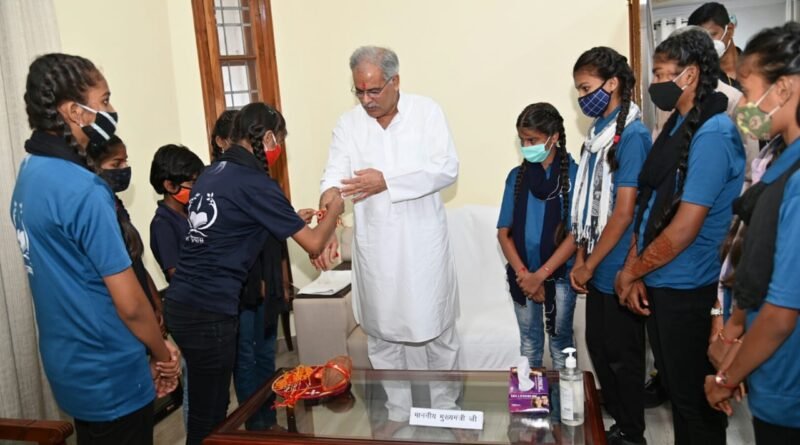 रायपुर :- रक्षाबंधन के पावन अवसर पर मुख्यमंत्री भूपेश बघेल के निवास कार्यालय में आज श्री प्रयास एजुकेशन सोसायटी टिकरापारा रायपुर की छात्राओं ने मुख्यमंत्री श्री बघेल को राखी बांधी। छात्राओं ने तुलसी का पौधा भेंट कर मुख्यमंत्री को उनके जन्मदिन की अग्रिम शुभकामनाएं दीं। मुख्यमंत्री ने बच्चों के इस स्नेह और सम्मान के लिए उन्हें धन्यवाद दिया और उन्हें उपहार भेंट कर उनके उज्ज्वल भविष्य के लिए आशीर्वाद दिया।