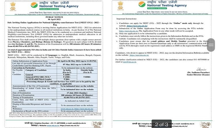 नई दिल्ली :- देश के सभी आयुर्विज्ञान संस्थानों में चिकित्सा स्नातक पाठ्यक्रमों में प्रवेश के लिए 2022 की नीट परीक्षा सत्रह जुलाई को होगी। राष्ट्रीय परीक्षा एजेंसी एन.टी.ए. ने वेबसाइट neet.nta.nic.in पर नीट 2022 का पंजीकरण शुरू कर दिया है। आवेदक इस वेबसाइट के माध्यम से, ऑनलाइन आवेदन जमा करा सकते हैं।